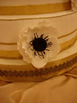 I was blessed to be able to make a wedding cake for sweet Laura a couple of weekends ago. It was such a neat collaborative process that we went through together to come up with a unique and beautiful cake. Initially I was worried that I wouldn't be able to come up with something that she would love because she was so open and easy going about what she wanted in a cake. After she emailed me pictures of three very different cakes that she liked I was even more concerned. Once we talked and I learned which elements she liked from each cake: crimped fondant, gold ribbon, white anemones with black centers, the vision started to take shape.